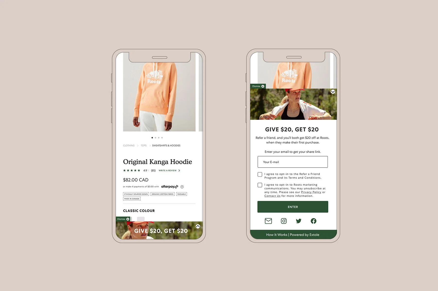 To encourage organic growth and brand advocacy, I partnered with marketing and engineering teams to design and launch Roots’ first customer referral program. The experience balanced simplicity with incentive, creating a seamless flow for both referrers and invitees. The program successfully increased referral-driven traffic and conversions, helping strengthen community and customer loyalty.